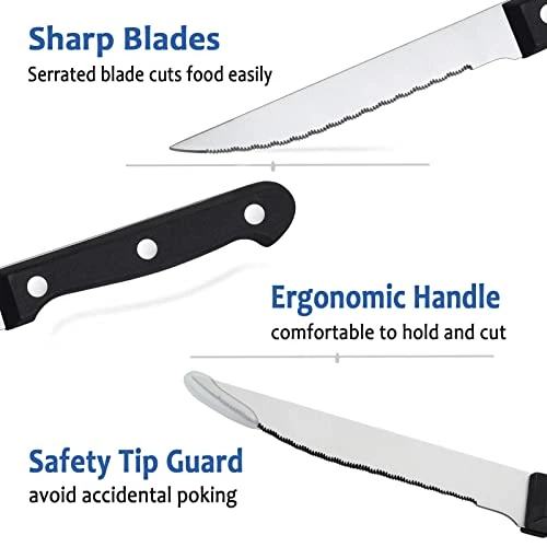 - 🥓【Serrated Blade and Triple Rivet Handles】 This 4.5” triple riveted steak knife set features a serrated blade for easy, precise and effortless cutting. Besides, the triple riveted handles provide reliable strength and comfortable weight and balance to ensure each knife is properly weighted for balance and control while cutting.
