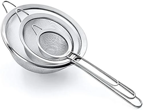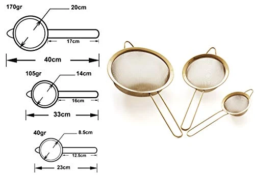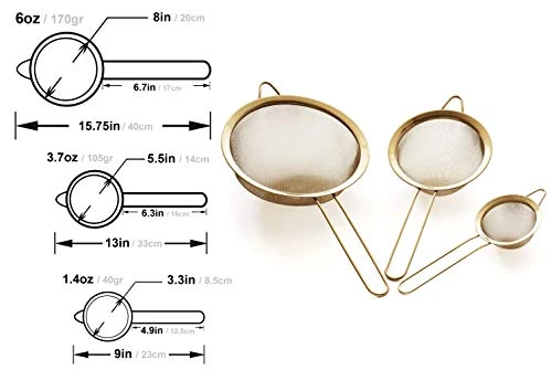 - 3.3″, 5.5″ & 8″ SIZES WITH FINE TWILL MESH – organise yourself with our professional quality kitchen strainer set of 3, 3.3″,5.5″ and 8″. Our unique strainers, larger than average sizes are versatile for a wide range of needs in the kitchen. Each strainer features fine twill mesh and a sturdy handle, so they can be hung or stacked for easy storage