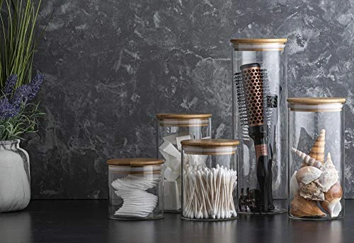 - SET OF 5 CANISTERS: Set includes one of each 11.8″ – 8″ – 6.6″ – 5″ – 4″.and measure 3.7″ diameter. Easy to care for, just place the glass jar in the dishwasher and wipe the lid with mild soap and warm water.