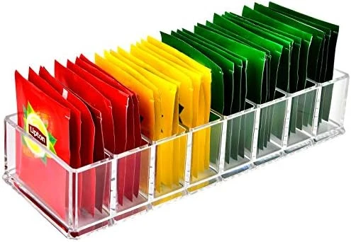 - STURDY AND DURABLE MATERIAL FOR SUGAR PACKET HOLDER: Tea bags storage is made of very strong acrylic, which is collision resistance, shockproof. Tea holder for tea bags organizer can ensure its durability and safety from injury and breakage. Black tea holder organizer size: 10 x 3.5 x 1.85 inches, each internal cube size is 1.5 x 1.18 inches.