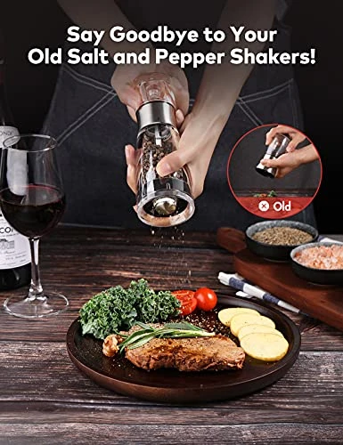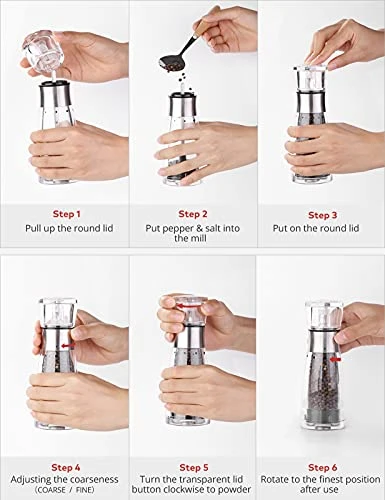 - Easy to Clean and Use Incredibly easy to clean,Just open the transparent top round lid and rinse it under the faucet to be as clean as new.One Step Refill–Both the Pepper & Salt mill are amazingly easy to refill.Simply pull up on the top round lid section to reach the chamber and pour in your freshly new peppercorns or coarse sea salt,It is manually operated and reusable. Maintain the freshness,keep moisture and dust away.