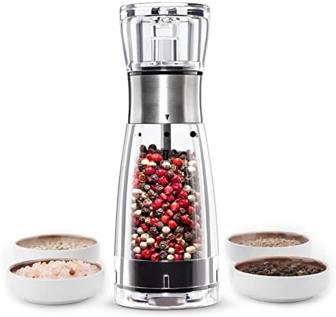 - Modern and Unique Style The high-quality clear acrylic pepper mill with a stylish SUS304 stainless-steel finish will look cool,BPA Free,the grinders extremely durable with no risk of glass breakages.The clear acrylic body can help you identify the sea salt and pepper easily and will let you know when it’s time!It makes seasoning your food supremely efficient without sacrificing great flavor.Its will be the highlight of your dining table๏ผ๏ผ