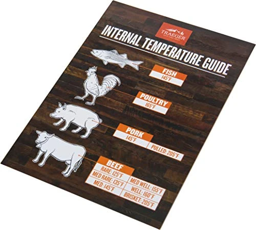 - Guide includes recommended internal temperatures for fish, poultry, pork, and beef