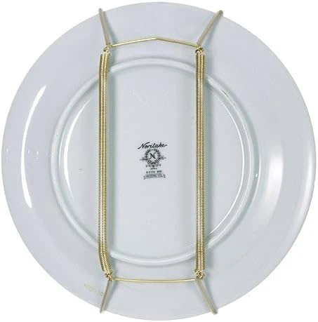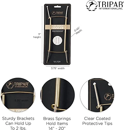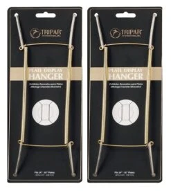 About the product: Sturdy brass finish wires with clear plastic coated tips that firmly grip and protect the edge of the plate. Hangers are connected by a flexible coiled wire that easily conforms to most plates. Ideal for round, oval scalloped plates or tiles. Holds up to 2 lbs. Hook and nail included.