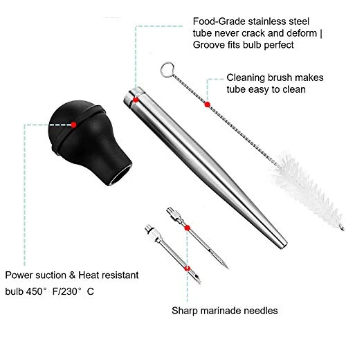 - [TURKEY BASTER SET] 1 x stainless steel turkey baster, 2 x marinade needles, 1 x cleaning brush