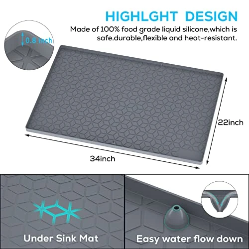 Under Sink Mat For Kitchen, 34″x22″ Silicone Waterproof Under Sink Shelf Liner, Flexible Sink Cabinet Organizer Tray, Hold Up To 3.3 Gallons Liquid, Sink Protector Tray With Drain Hole Easy To Clean