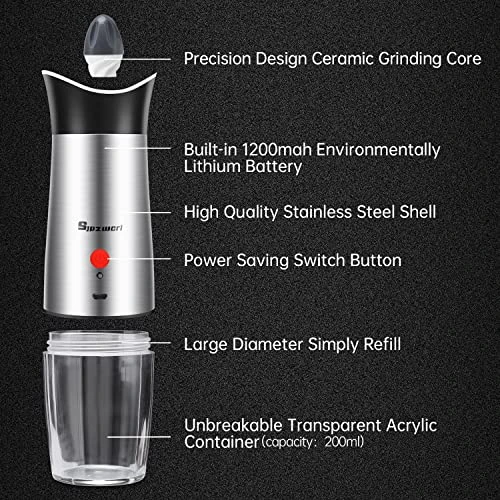 - ✅The larger and wider container of capacity 7Oz (200ml) ensures that you can enjoy fresher spices freely. The container is made of BPA-free acrylic material, which ensures that your spices are kept fresh and safe. The strengthened ceramic rotor blade and stainless steel shell make the grinder set durable and long-lasting.