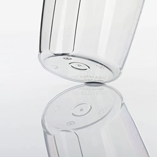 - 500 mL/17 oz capacity; with mixing insert and cap; measurements in milliliters and ounces on side