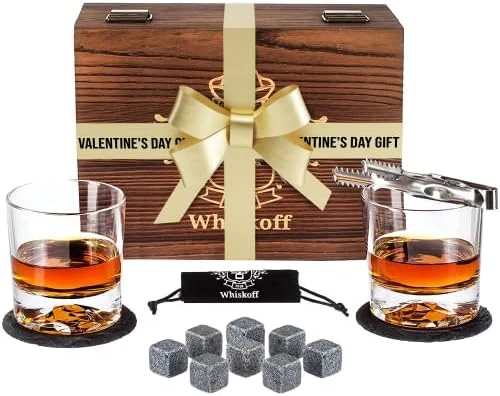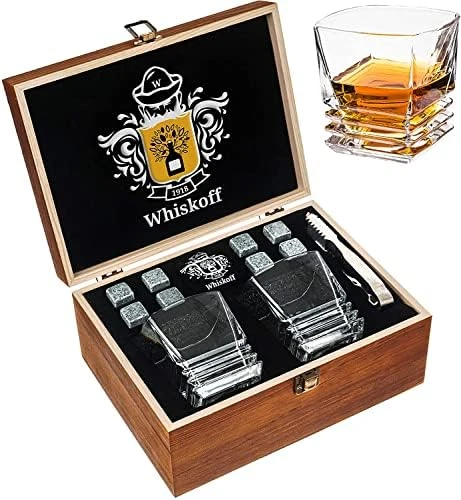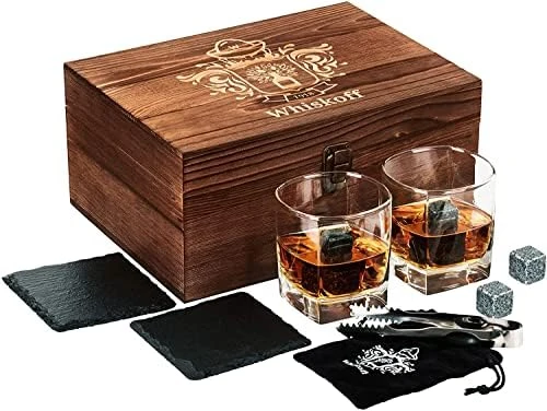 - 🥃 𝗣𝗥𝗘𝗠𝗜𝗨𝗠 𝗖𝗥𝗔𝗙𝗧𝗘𝗗 𝗪𝗢𝗢𝗗𝗘𝗡 𝗚𝗜𝗙𝗧 𝗕𝗢𝗫: Whiskey glasses and chilling stones set comes in a luxurious wooden gift box for perfect gift ideas. Our whiskey gift set is an absolute must-have for a scotch, bourbon or whiskey lover. Make your loved ones happy with an awesome cocktail or home bar gift with chilling stones. Bourbon drinker gift ideas for him and for guys who have everything, groomsmen, stepfather, step dad, friends or wisky lovers men.