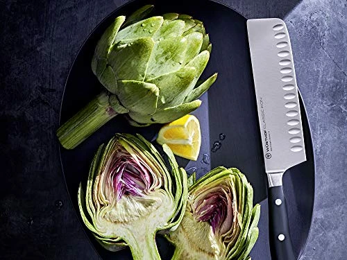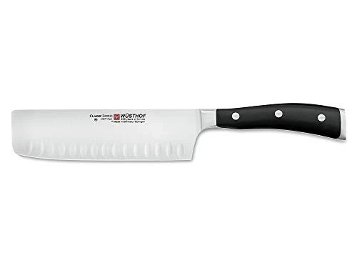 - ASIAN KNIFE – The CLASSIC IKON 7″ Nakiri Knife is designed with a thinner blade than the traditional cleaver, at a 10° cutting edge, and features a long straight edge. The hollow edge is crafted with evenly spaced vertical indentations, which create small air pockets between the blade and the food